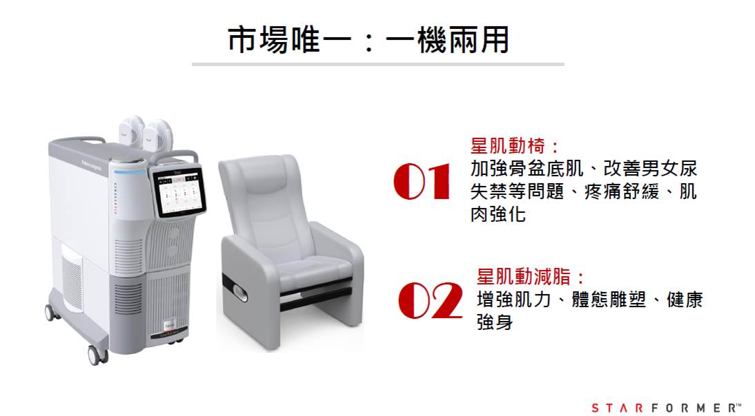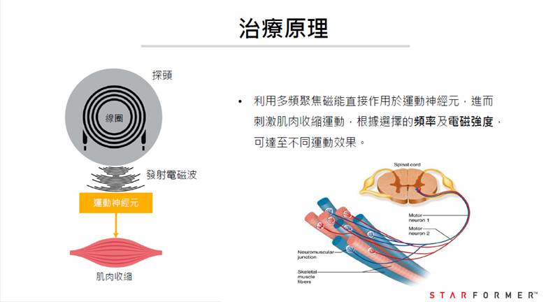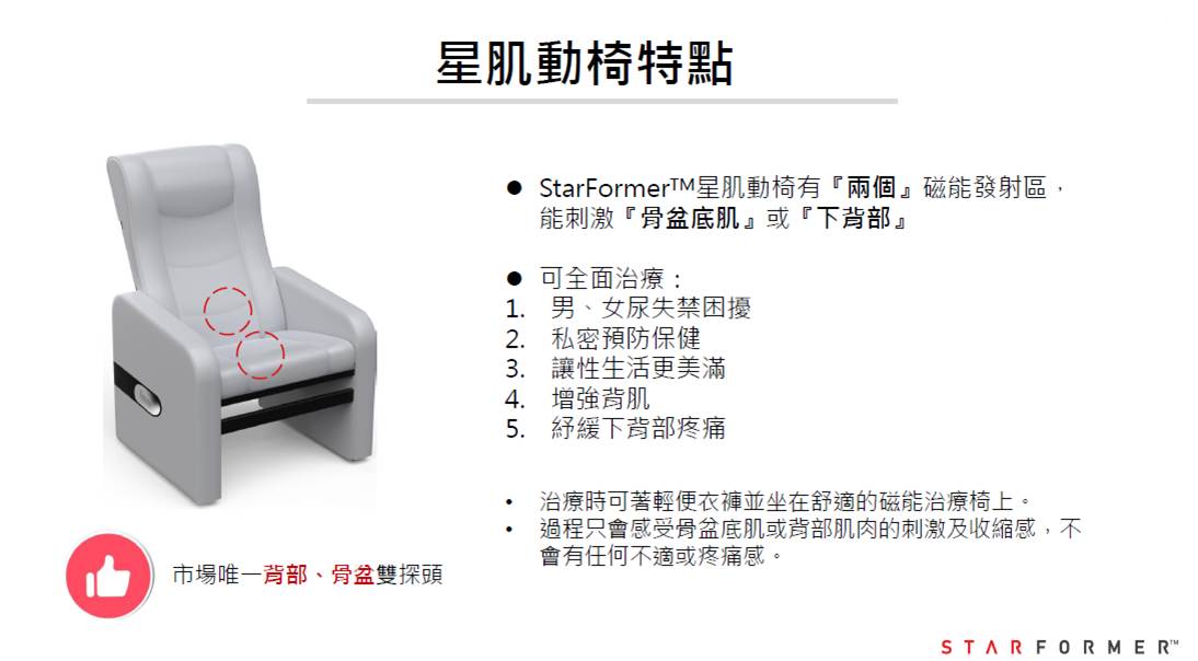 星肌動減脂/星肌動椅(英文名稱 “Fotona Starformer System”,仿單名為「富多拿」星塑電磁刺激儀),是一種非侵入性刺激肌肉的治療方式。透過高能量聚焦磁能科技,磁能量可直接穿透至 7-10 公分的肌肉層,直接觸發運動神經元,於 30 分鐘內可進行 20,000-30,000 次超極限肌肉運動,有效訓練肌肉,最終提升肌肉量。