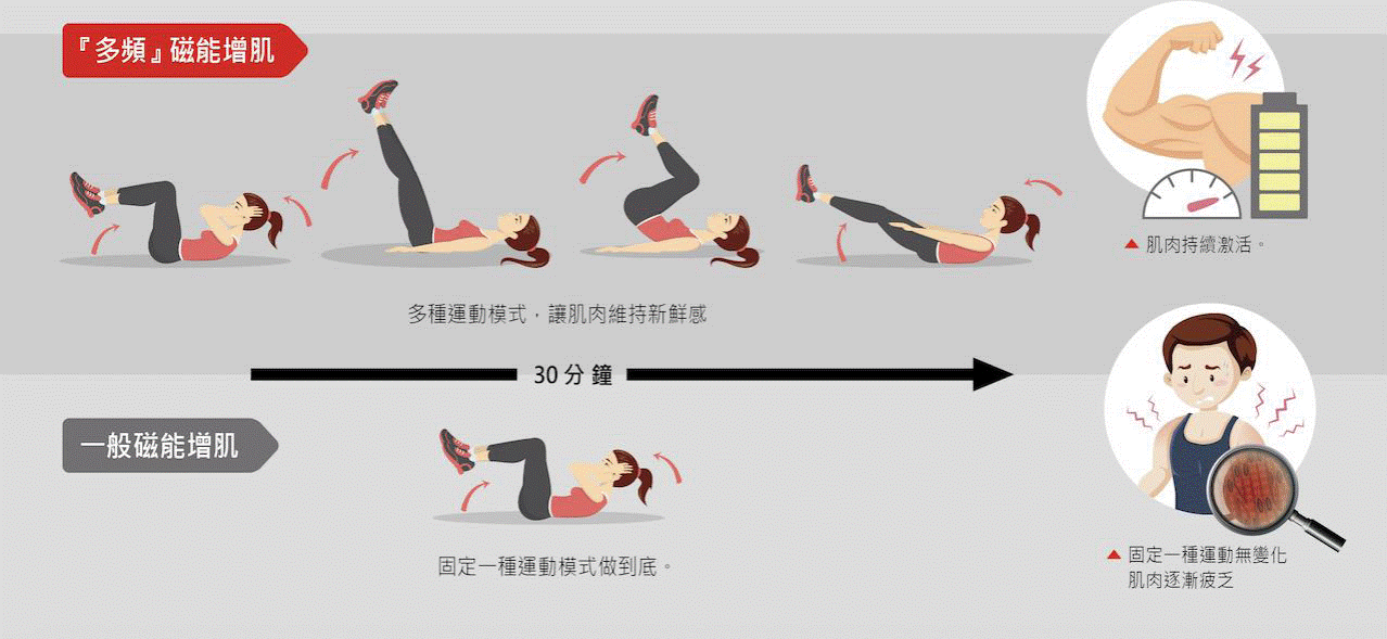 透過「多頻式」磁波模式的靈活變化,讓肌肉持續處於活化狀態,避免陷入單一運動模式,減少肌肉疲勞並提升訓練效率。
