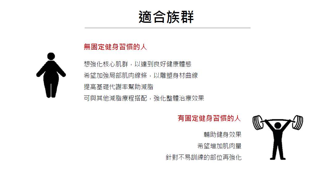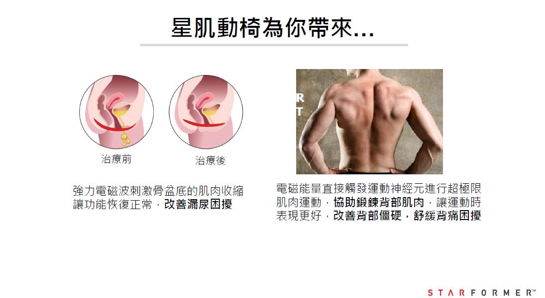 電磁能量能直接刺激運動神經元,帶來超極限肌肉運動,有效強化背部肌群,幫助運動表現更佳,同時改善背部僵硬、舒緩背痛困擾。