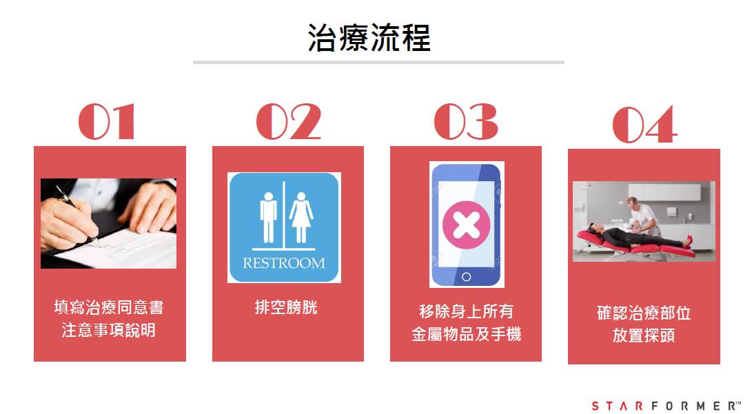 A:每次治療約20-30分鐘,建議每週2次,至少需治療6-8次。實際療程規劃請依醫師專業評估為主。